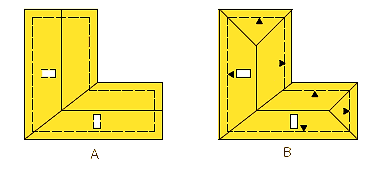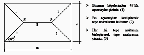 Çatı tanziminde uygulanacak yol, bina köşelerinin açı ortaylarını uzatarak kesişen noktaları birleştirmektir.