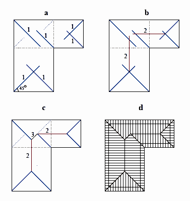 - Kesişen tepe noktaları düz çizgilerle uzatılarak ve diğer köşe açıortaylarıyla birleştirilerek tepe mahyası çizilir. (b)