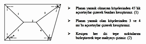 - Tüm köşelerinden 45’lik açıortaylar (eğik mahya) çizilerek kesiştirilir. (a)